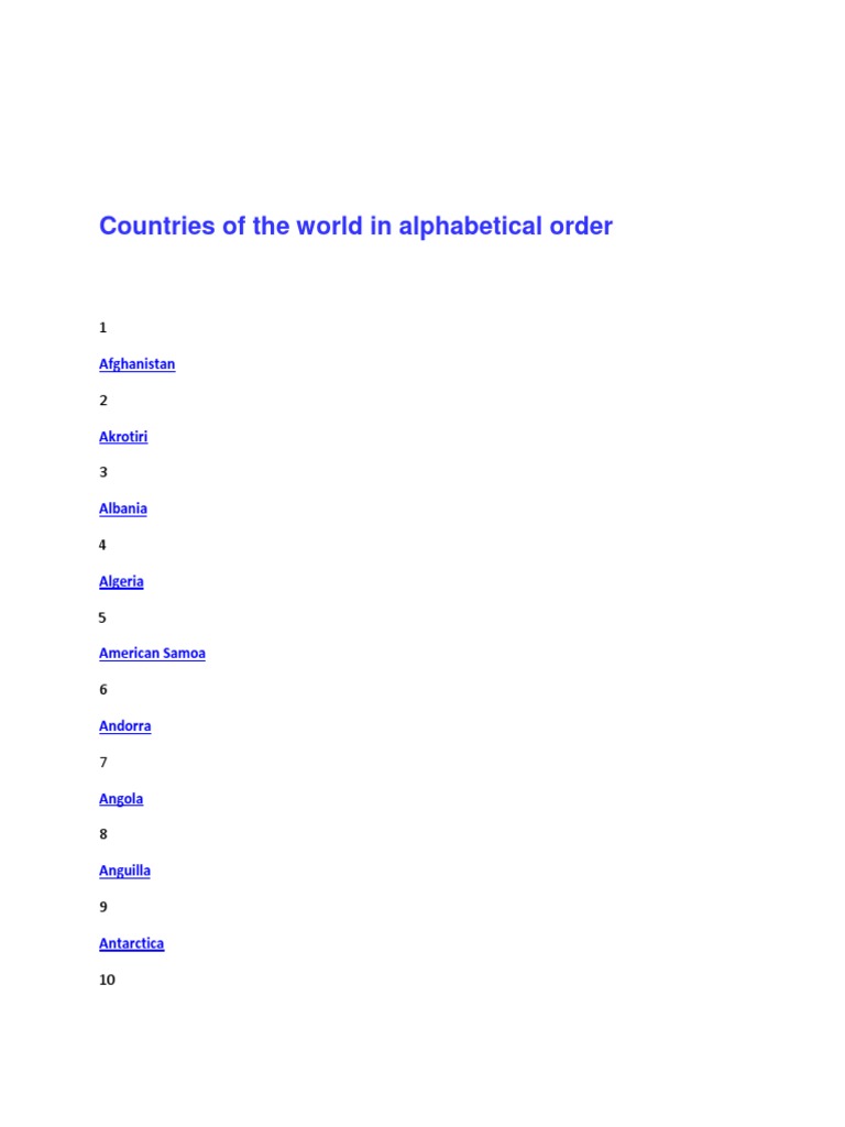 Here we mention the entire country abbreviations list in alphabetic order below Alphabetical list the travelers' century club®'s official list of countries and territories is shown below in alphabetical order, a total of 329 as of dec. Sort the countries alphabetically and ratings. This includes all countries in the countries of the world quiz! Links in the list lead to the corresponding country profile.